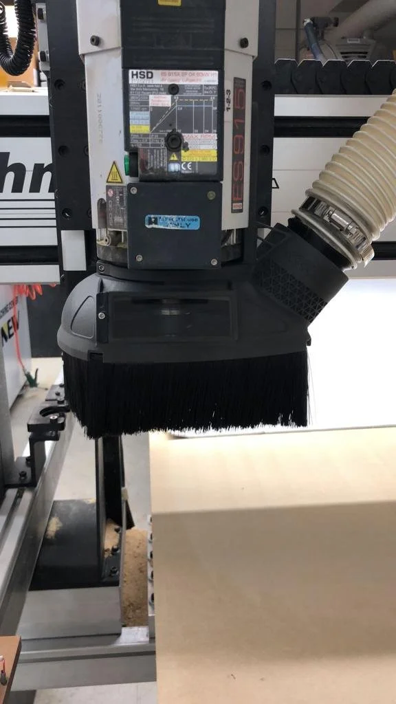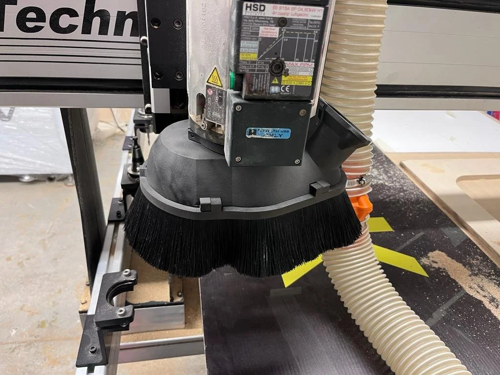 The Default Factory Dust Boot came with a significant number of flaws. due to the orientation of the boot, only 6 tool-heads could be mounted on the rack. The vacuum hose would also often catch on the components being milled due to the loose and unstable Fit.